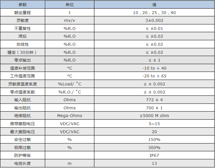 SBD-40t 型號(hào)說(shuō)明:雙剪切梁式傳感器,容量40t,13M電纜