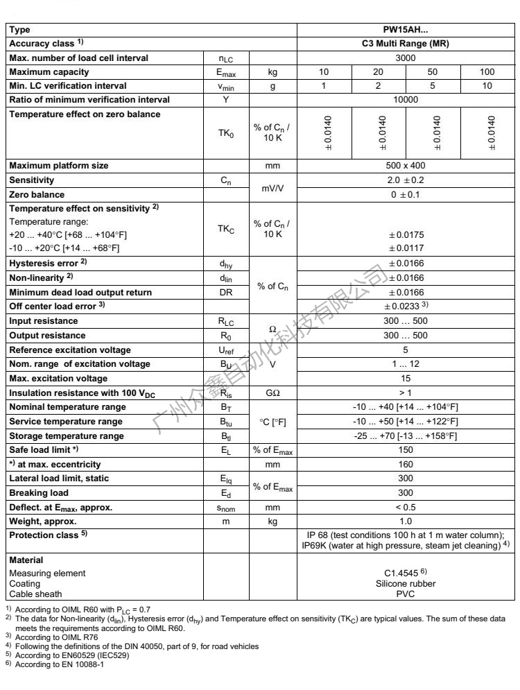 五、PW15AHC3稱重傳感器技術(shù)參數(shù)
