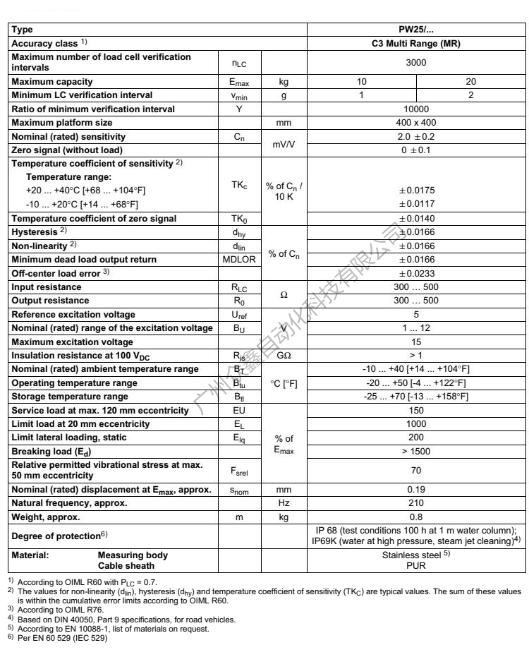 五、PW25C3稱重傳感器技術(shù)參數(shù)