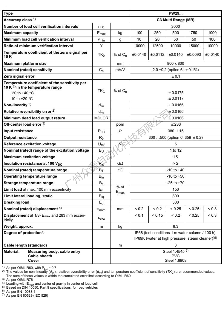 五、PW29C3稱重傳感器技術參數(shù)
