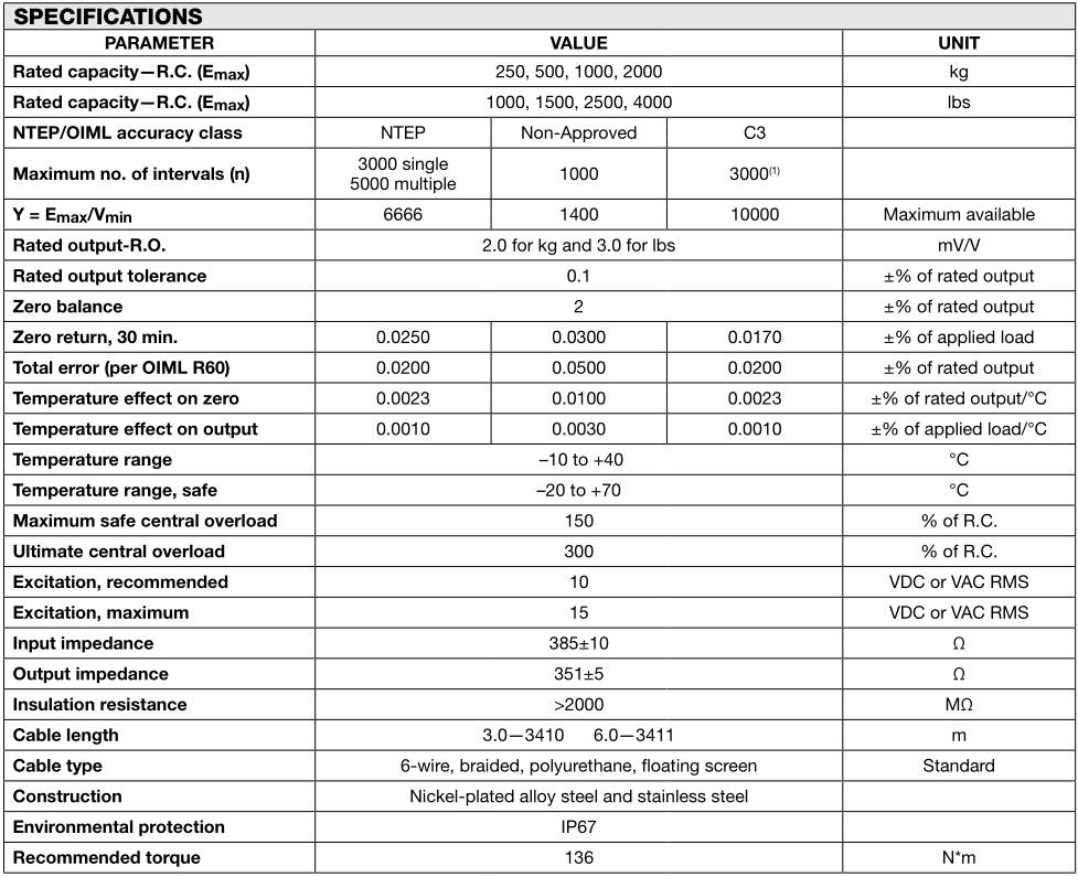 Tedea-Huntleigh特迪亞3411系列技術(shù)指標(biāo)