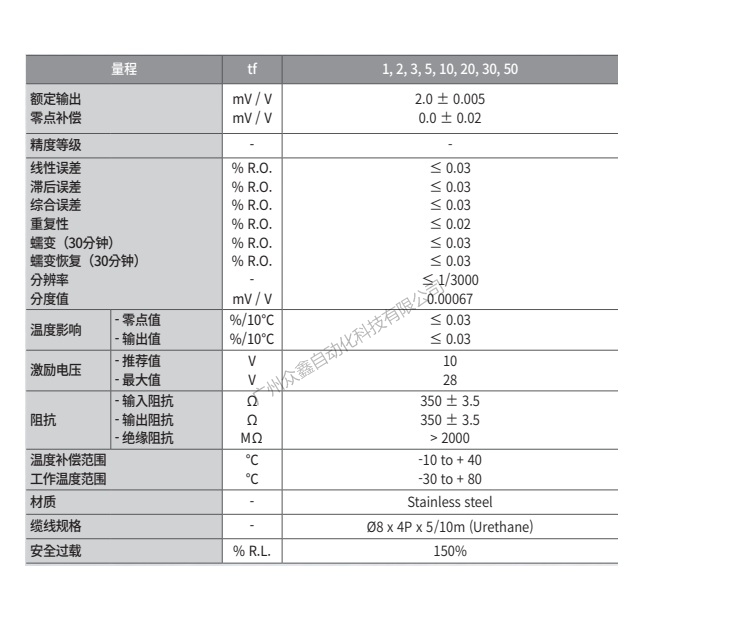 五、韓國凱士CAS品牌 LSS-50T-EXP稱重傳感器技術參數