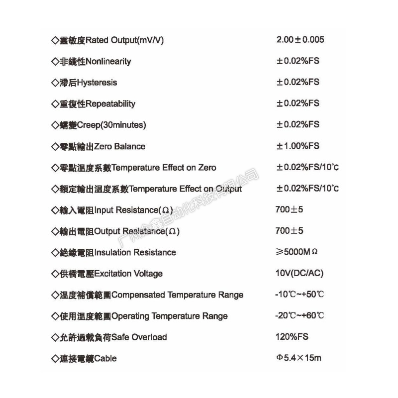 四、CP-11-30T稱重傳感器技術(shù)參數(shù)