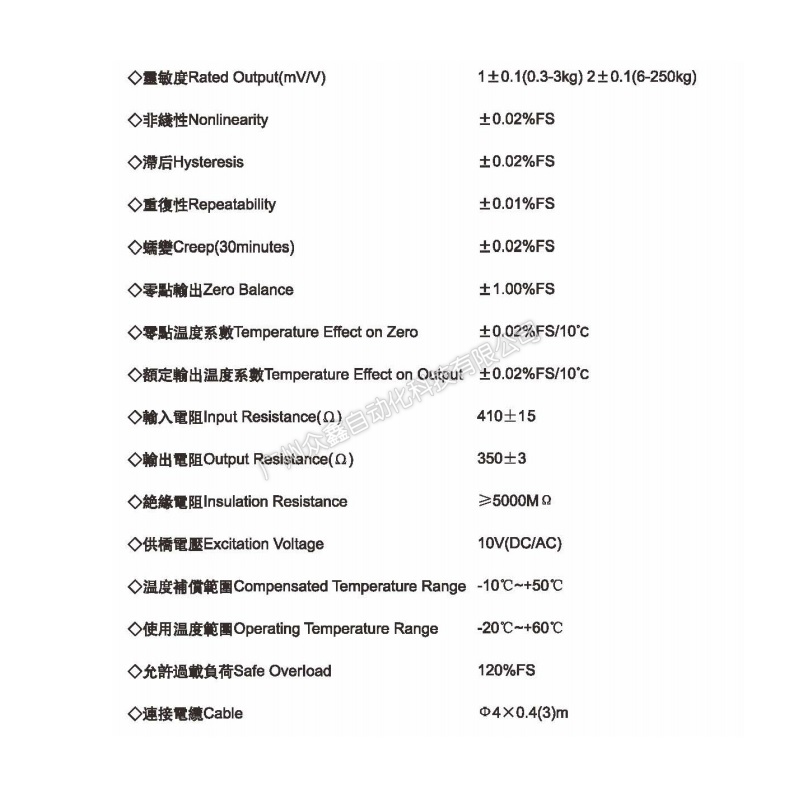 四、PE-1-250kg稱重傳感器技術(shù)參數(shù)