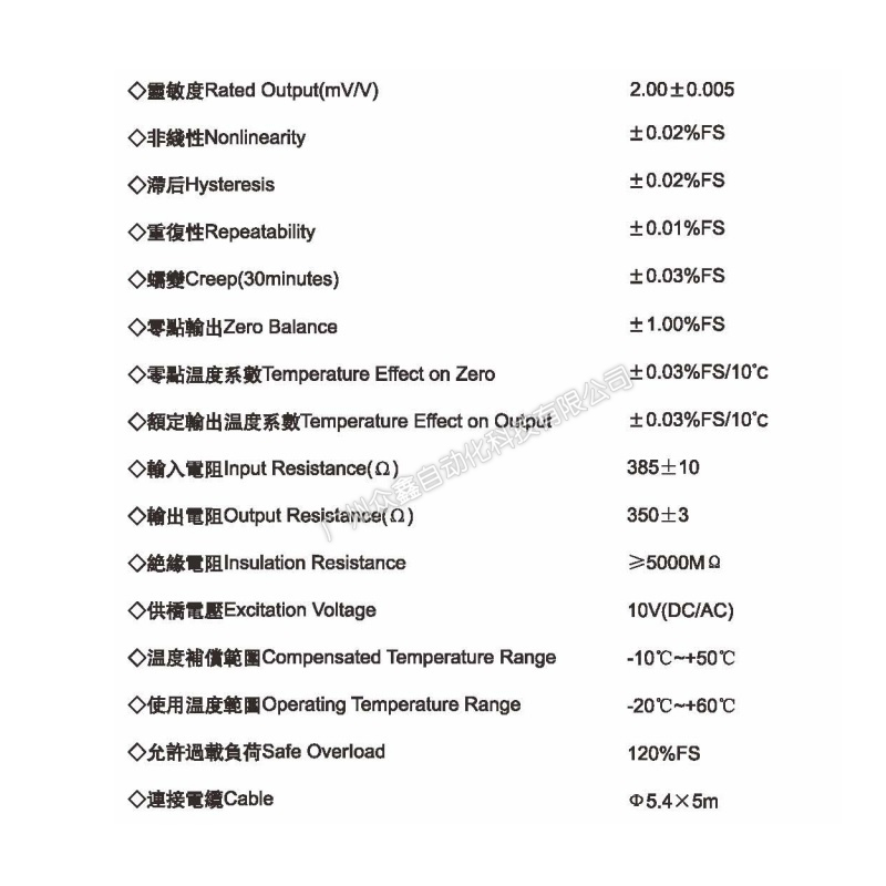 四、PE-8-1T稱重傳感器技術(shù)參數(shù)
