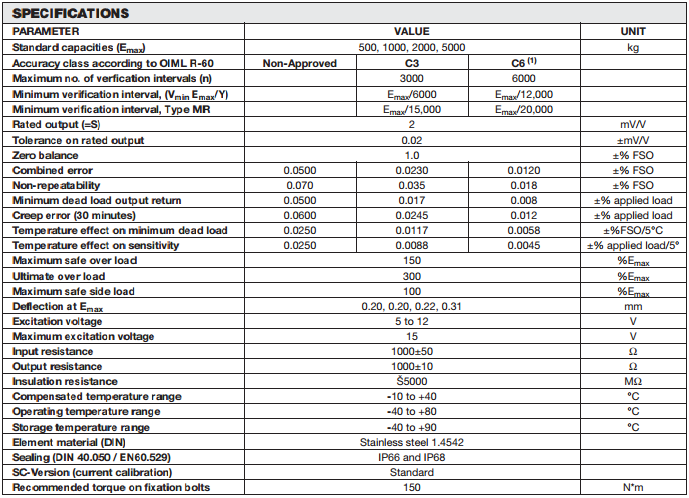 美國Vishay Revere稱重傳感器SSB系列產(chǎn)品參數(shù):