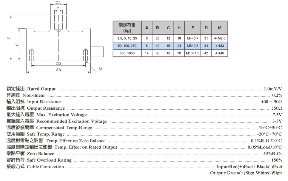 MLT荷重元係高精度,拉壓雙向力量感測器,使用應變規(guī)為感測元件,變形 量小,精度高;所有感測電路均藏於金屬彈性體內,完全密封保護,不受外界干 擾,穩(wěn)定性高;具以下之特點: 拉壓雙向 剛性強 溫度補償 整體密封保護