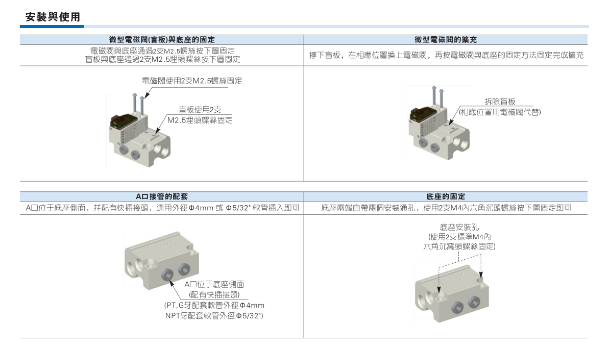 使用電磁閥集成閥組,可節(jié)省空間,并減少需添購(gòu)配件之?dāng)?shù)量。