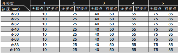 SCM系列開關(guān)安裝數(shù)與最小行程(mm):