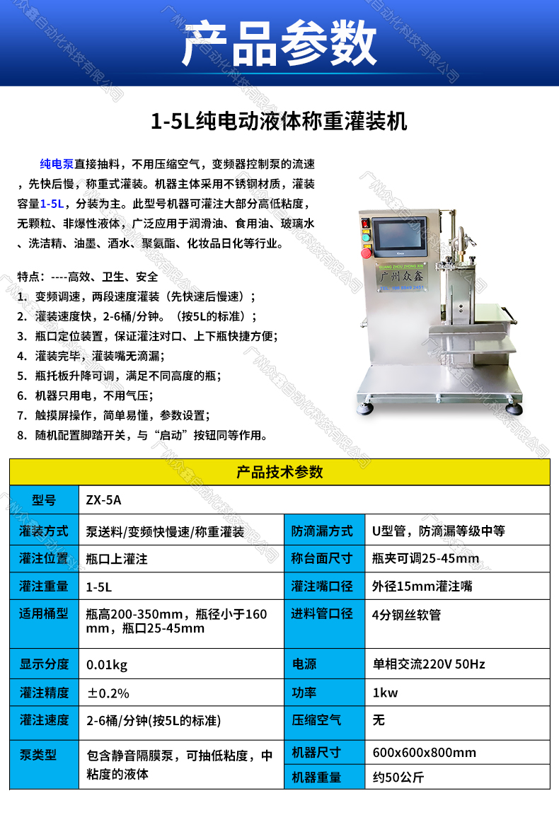 純電泵直接抽料,不用壓縮空氣,變頻器控制泵的流速、先快后慢,稱重式灌裝。機器主體采用不銹鋼材質,灌裝容量1-5L,分裝為主。此型號機器可灌注大部分高低粘度,無顆粒、非爆性液體,廣泛應用于潤滑油、食用油、玻璃水、洗潔精、油墨、酒水、聚氨酯、化妝品日化等行業(yè)。