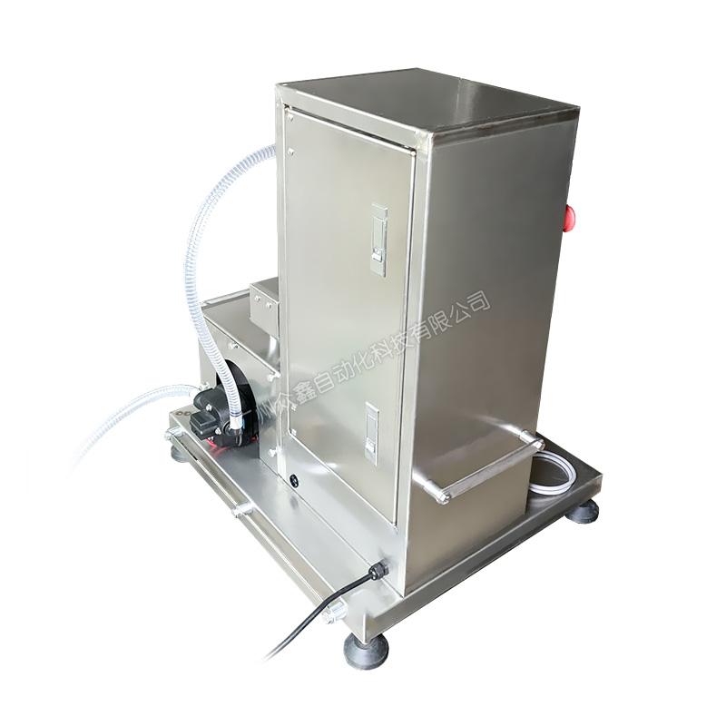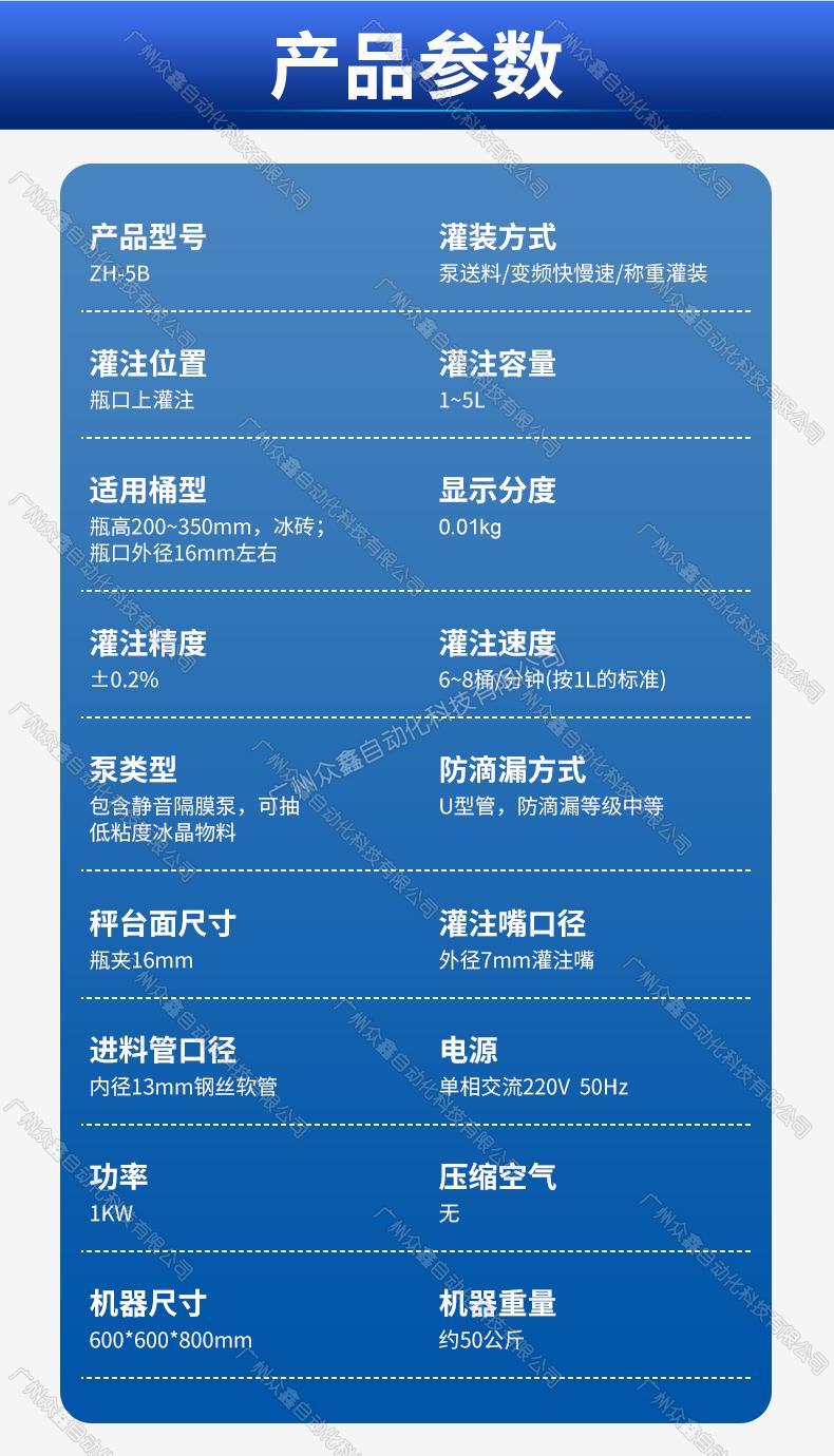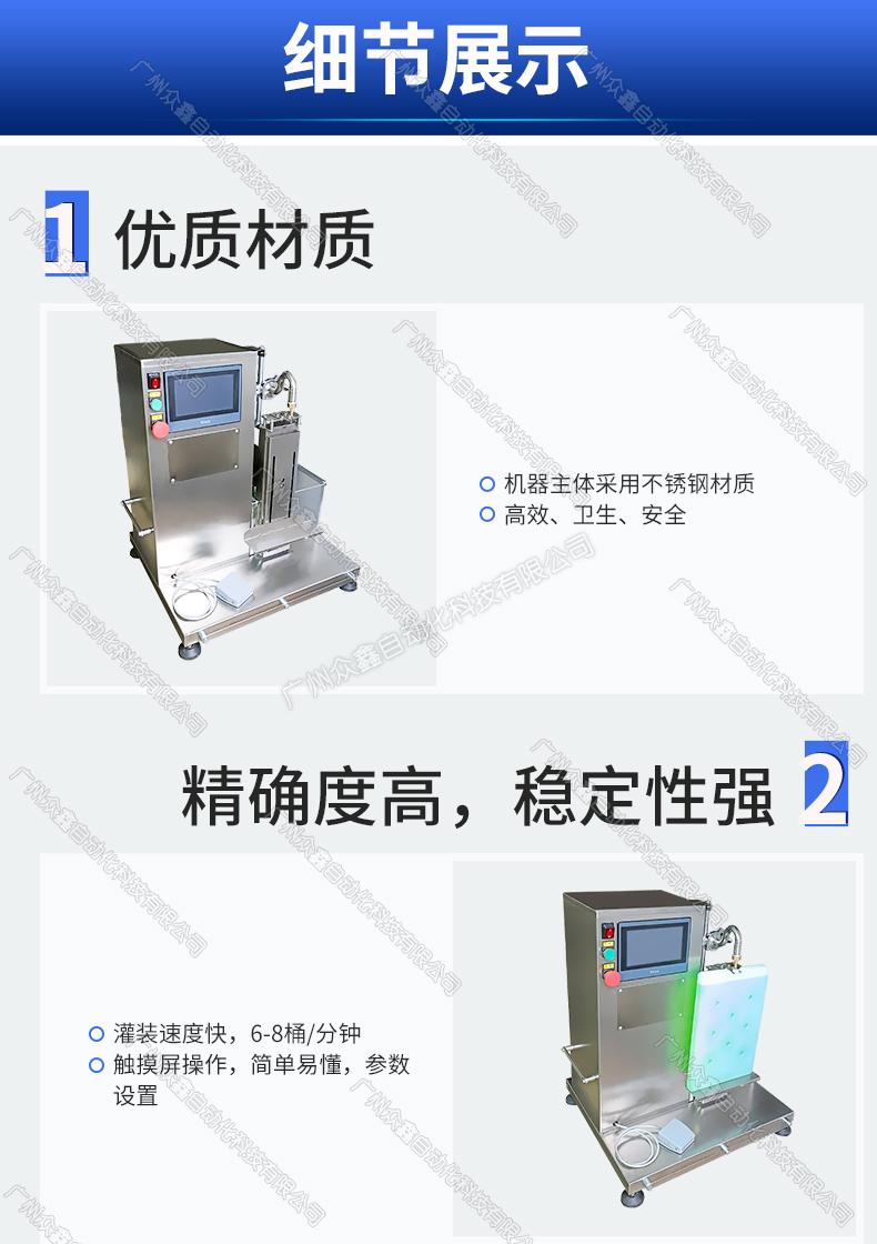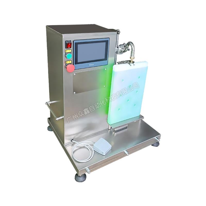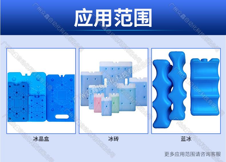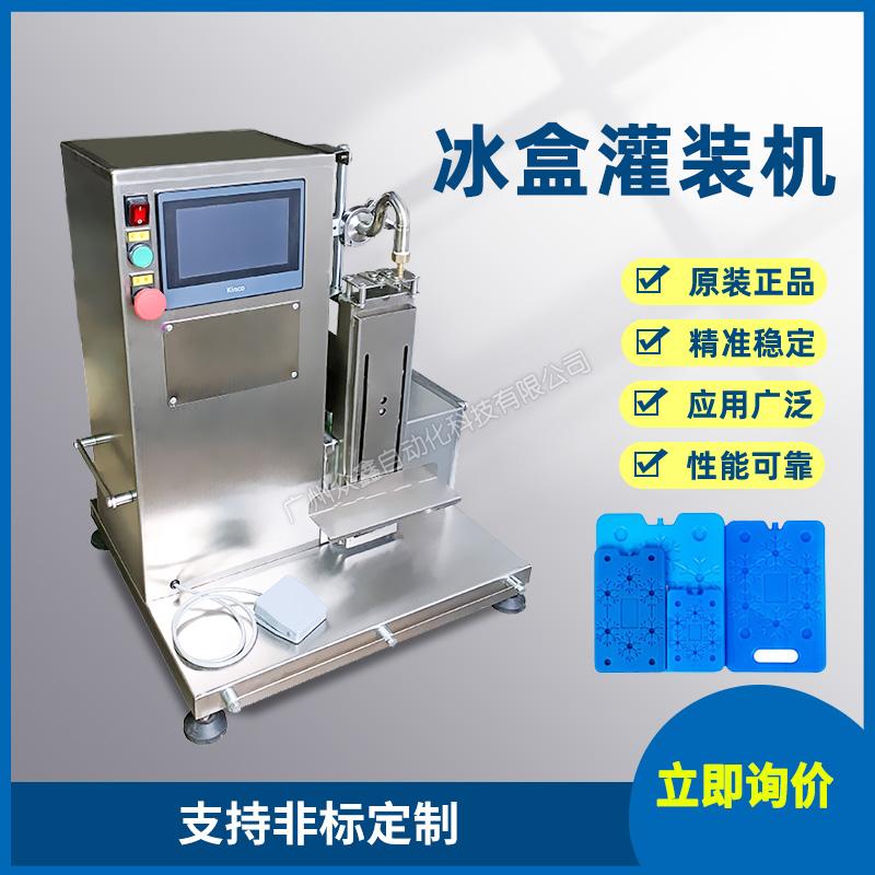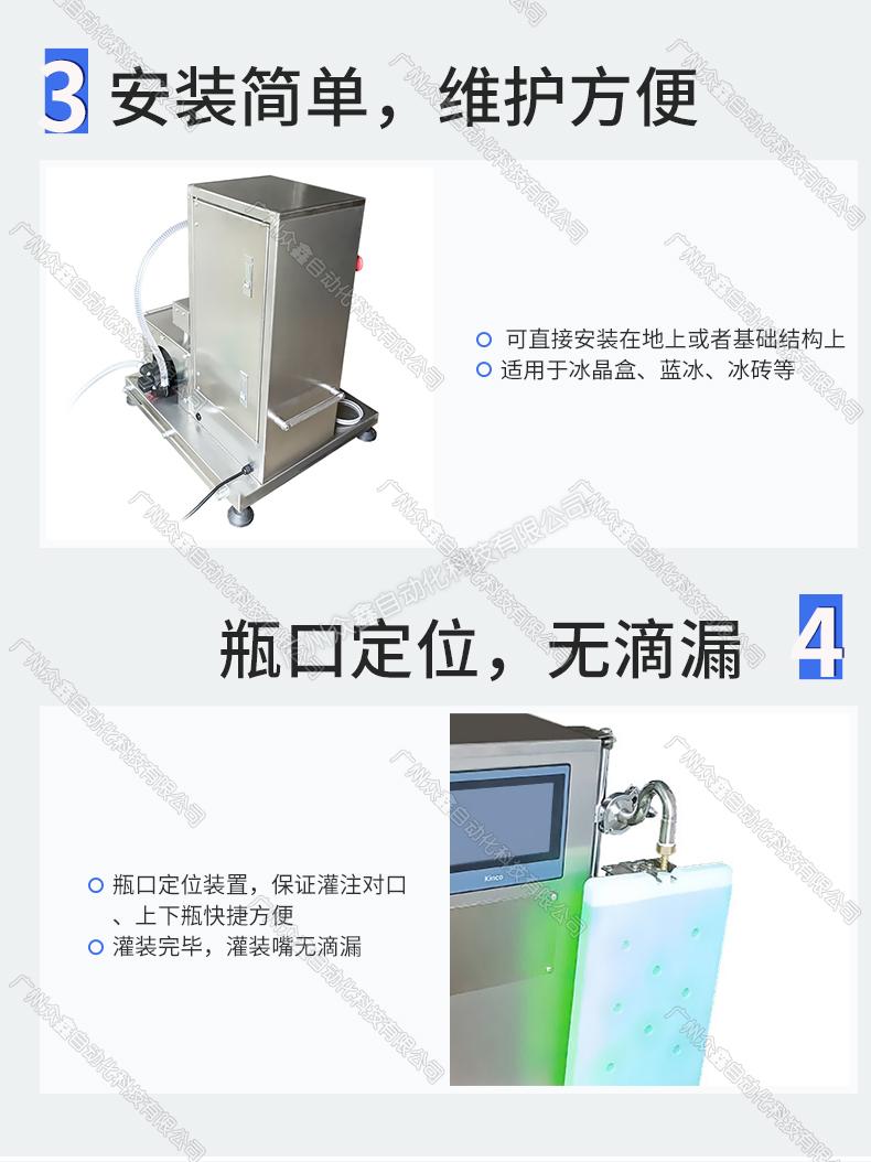 純電泵直接抽料,不用壓縮空氣,變頻器控制泵的流速,先快后慢,稱重式灌裝。機(jī)器主體采用不銹鋼材質(zhì),灌裝容量1-5L,分裝為主。此型號機(jī)器可灌注小口徑冰晶盒、藍(lán) 冰、冰磚等。