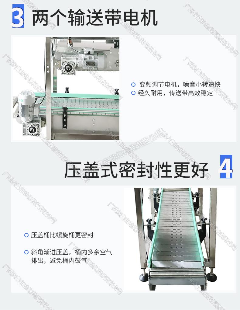 上下兩條輸送鏈板同步壓合桶蓋,斜角漸進(jìn)壓蓋,桶內(nèi)多余空氣排出,避免桶內(nèi)鼓氣。自動(dòng)化生產(chǎn),無需人為操作,降低用人成本,提高生產(chǎn)效率。
