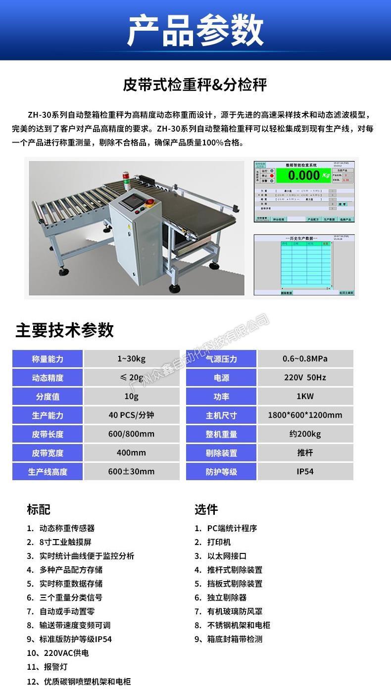 ZH-30系列自動(dòng)整箱檢重秤為高精度動(dòng)態(tài)稱重而設(shè)計(jì),源于先進(jìn)的高速采樣技術(shù)和動(dòng)態(tài)濾波模型、完美的達(dá)到了客戶對(duì)產(chǎn)品高精度的要求。ZH-30系列自動(dòng)整箱檢重秤可以輕松集成到現(xiàn)有生產(chǎn)線,對(duì)每一個(gè)產(chǎn)品進(jìn)行稱重測(cè)量,剔除不合格品,確保產(chǎn)品質(zhì)量100%合格。