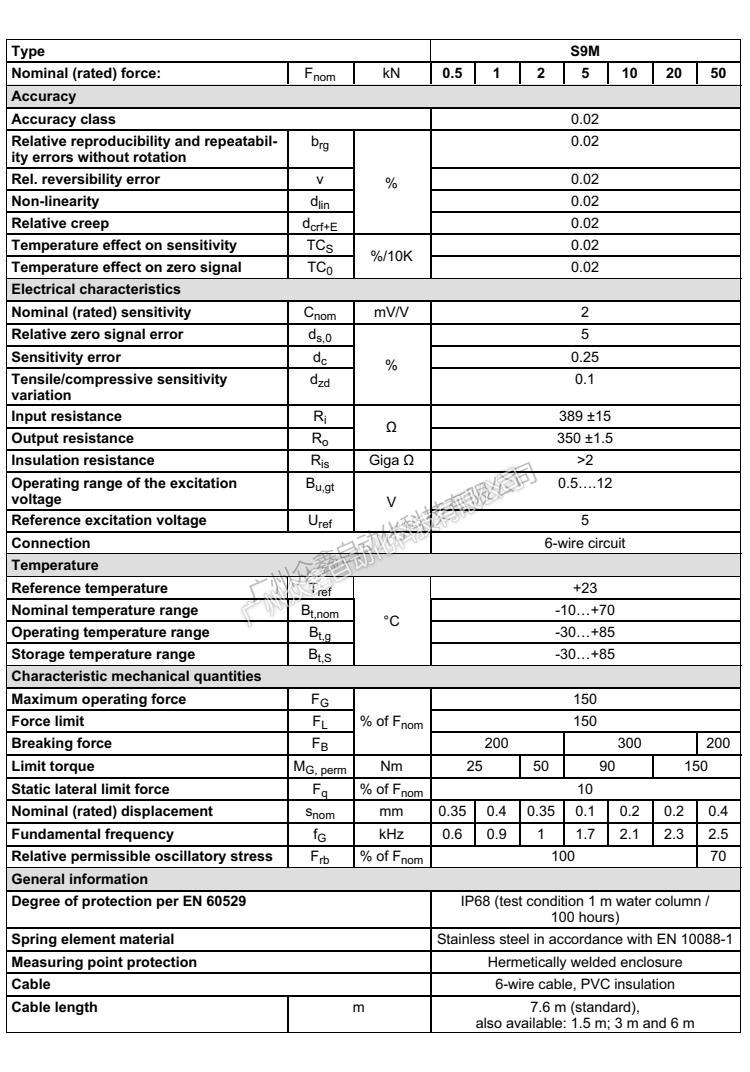 德國HBM S9M力傳感器系列所有量程如下: