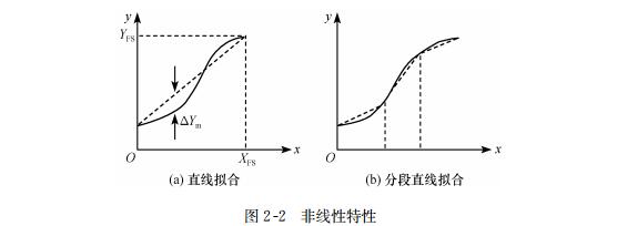 由于非線性是以某種擬合直線為基準(zhǔn)線而定的,故不同的擬合所得的線性度不同。常用的擬合方法有基準(zhǔn)線性擬合、獨(dú)立線性擬合、最小二乘法擬合等。很明顯,這種擬合將產(chǎn)生線性化誤差。圖2-2(b)所示的分段折線逼近曲線將有較高的擬合精度,分段越多,擬合精度越高。例如,傳感器后接微機(jī)系統(tǒng),線性補(bǔ)償將是非常容易的,可有效地提高傳感器的測量精度。