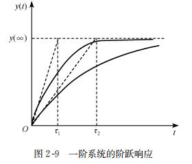 由多個(gè)慣性環(huán)節(jié)組成的開環(huán)系統(tǒng),其階躍響應(yīng)呈單調(diào)變化,可用上升時(shí)間、階躍響應(yīng)時(shí)間或穩(wěn)定時(shí)間三者之一來描述其性能。對簡單的只有一個(gè)慣性環(huán)節(jié)的系統(tǒng),只需給出時(shí)間常數(shù),階躍響應(yīng)可立即完全確定,見圖2-9,有
