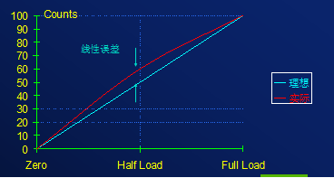 線性: 表示系統(tǒng)的實際輸出和理論直線的一致程度。如圖所示,當產生線性誤差時,系統(tǒng)在空載和滿載時的輸出是正確的,但這兩點 之間的輸入-輸出點和理想狀態(tài)不一致。線性誤差就是理論直線和實際輸出曲線之間的最大差值。