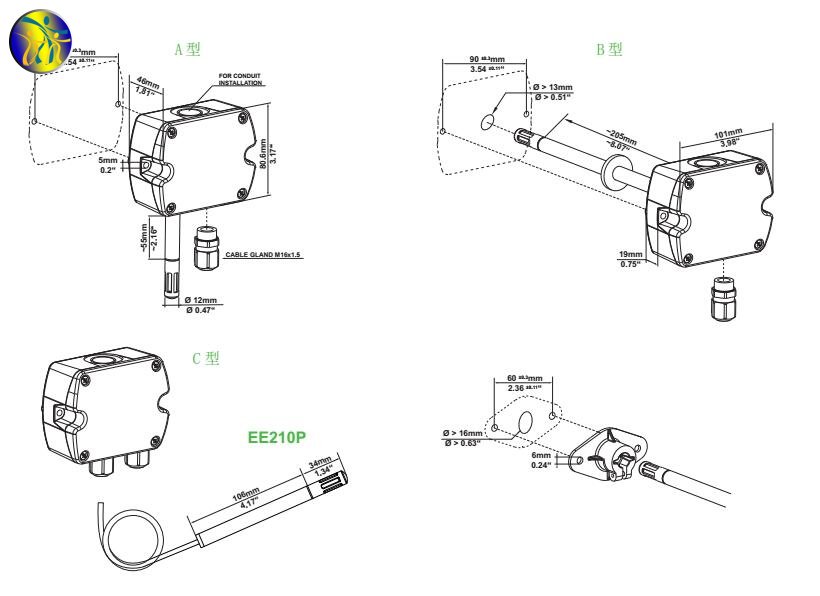 奧地利E+E EE210系列溫濕度傳感器外觀尺寸圖