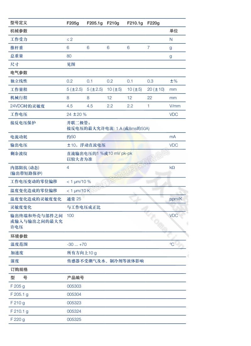 五、F220g位移傳感器技術(shù)參數(shù)
