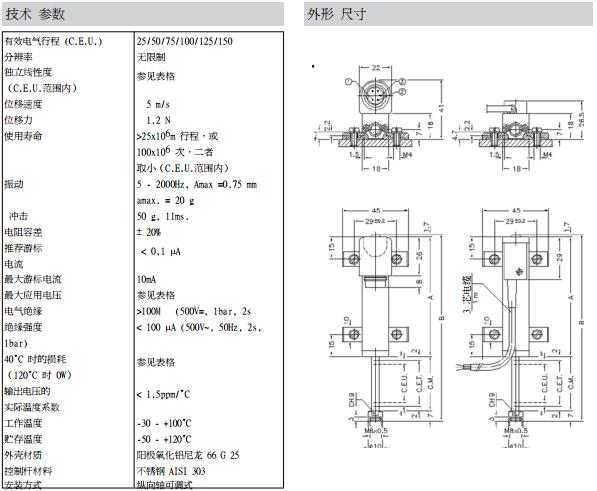 直線位移傳感器主要用于控制、調(diào)節(jié)和測(cè)量系統(tǒng)中對(duì)位移和長(zhǎng)度的直接精確測(cè)量,無(wú)拉桿設(shè)計(jì)使傳感器電刷在傳感器側(cè)面,沿傳感器長(zhǎng)度方向移動(dòng),這樣就避免了一般傳感器常見(jiàn)的由于“泵”效應(yīng)引起的傳感器失效問(wèn)題,并且量程可達(dá)3000豪米。新穎的球絞使由于不平或傾斜產(chǎn)生的扭力得到釋放,傳感器的承受拉力均勻。安裝卡具可以進(jìn)行微調(diào)?;诓牧虾凸に嚨年P(guān)系,位移傳感器的溫度系數(shù)極低,堅(jiān)固的結(jié)構(gòu)和材料使傳感器可以在惡劣的溫度和震動(dòng)條件下可靠工作。傳感器測(cè)量原理簡(jiǎn)單,無(wú)源以及絕對(duì)值輸出使得它不受外界的電磁影響,同時(shí)它不需要內(nèi)置電源,能在斷電時(shí)保持實(shí)時(shí)位移數(shù)據(jù)。